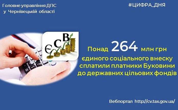 Понад 264 мільйони гривень єдиного соціального внеску сплатили платники Буковини до державних цільових фондів. Про це повідомляють в Головному управлінні ДПС у Чернівецькій області.