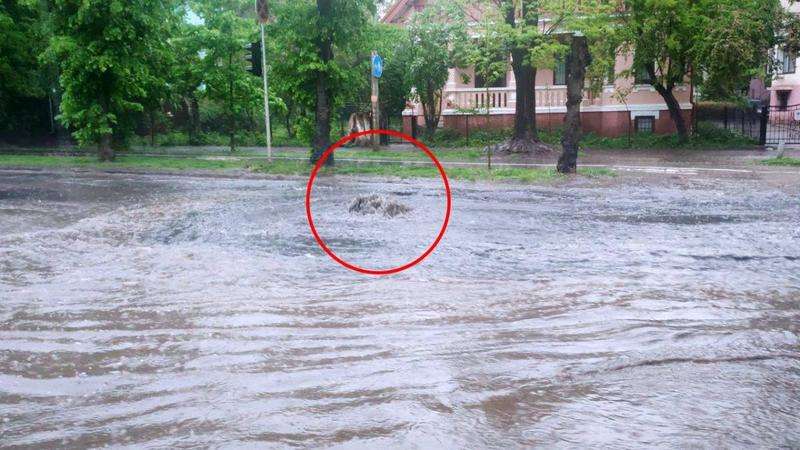 За повідомленням користувачів соцмереж, після грози з-під люка на цій вулиці стали фонтанувати каналізаційні стоки.