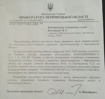Кам’янська сільська рада звернулася до правоохоронців щодо неправомірних дій посадових осіб Головного управління Держгеокадастру у Чернівецькій області.