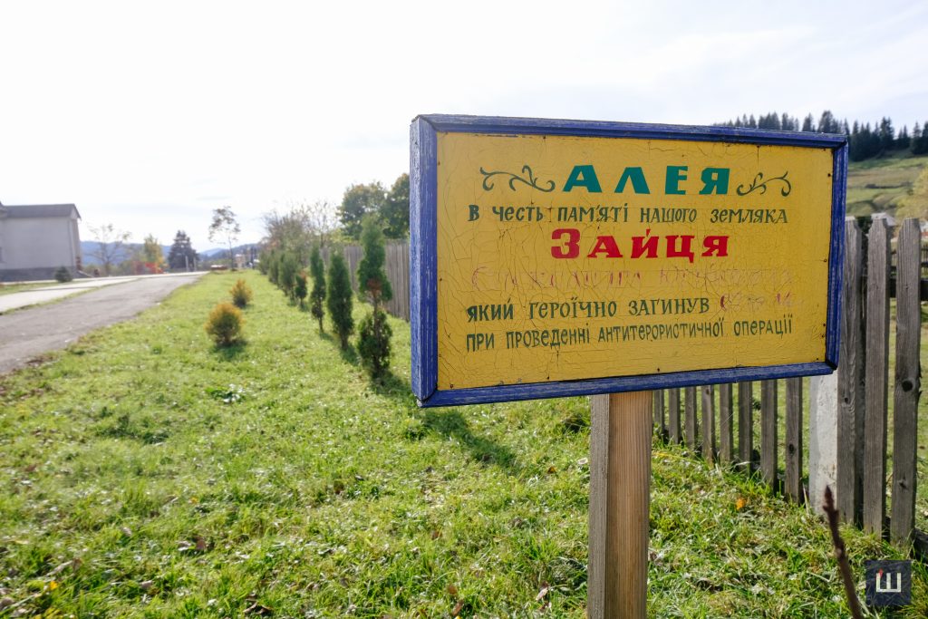 Селятин зустрічає теплою осінньою погодою. Аби вшанувати пам’ять героя, у центрі села односельчани встановили бігборд, на якому зображений Олександр Заєць.