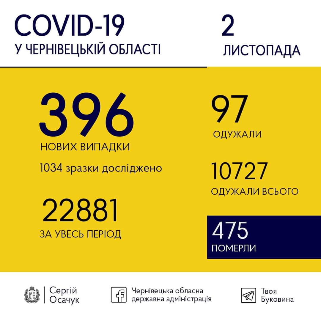 Станом на 3 листопада у Чернівецькій області виявили 396 нових випадків COVID-19. Одужали за минулу добу 97 буковинців.
