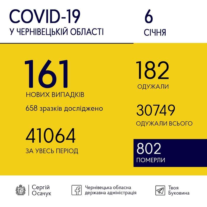 6 січня на Буковині виявили 161 новий випадок коронавірусу. Про це повідомив голова Чернівецької ОДА Сергій Осачук.