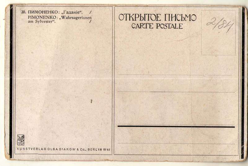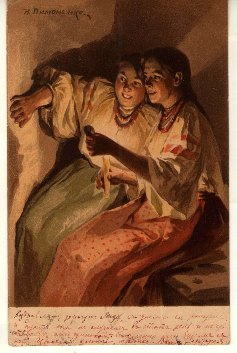 Серед численної колекції листівок з фондів ЧХМ зустрічаються два цікаві екземпляри з репродукцією відомої живописної композиції. Обидві художні листівки датуються початком ХХ століття. Місцем виготовлення однієї з листівок вказано Берлін. Зображення на листівці подано дещо узагальнено. Походження іншої поштівки остаточно не встановлено. Проте на ній досить виразно передається сюжет оригіналу. Композиційно все напрочуд органічно та живо відтворено, і одразу ніби поринаєш в те таїнство ворожіння (на воскові), де наче чутно тихий сміх двох святково вбраних молодих дівчат, що здивовано вдивляються в химерні тіні та контури на стіні, прагнучи відгадати свою долю. Мерехтливе полум’я свічки, мінливе світло на ніжних дівочих обличчях, теплі сутінки хати і синя ніч за вікном створюють неповторну казкову атмосферу.