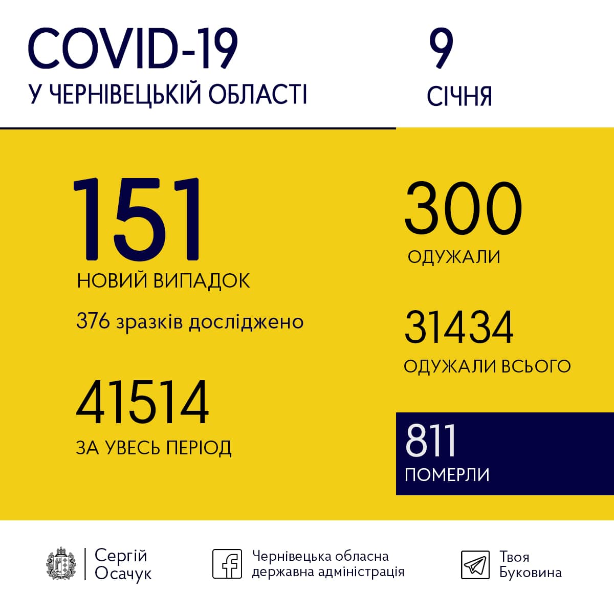 За минулу добу, 9 січня, у Чернівецькій області зафіксували 151 новий випадкок коронавірусного захворювання COVID-19. Таким чином, загальна кількість хворих сягнула 41 514. Із них 31 434 уже побороли хворобу. За минулу добу від недуги вилікувалися 300 осіб. За добу Чернівецький обласний лабораторний центр дослідив 376 зразків. Про це на своїй сторінці у фейсбуку повідомив голова Чернівецької ОДА Сергій Осачук.