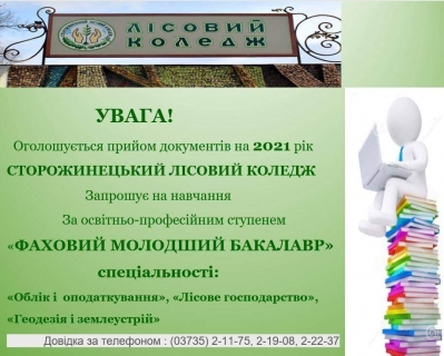 Нагадаємо, що у Сторожинецькому лісовому коледжі можна здобути освіту за трьома спеціальностями: «Лісове господарство», «Облік і оподаткування», «Геодезія і землеустрій». За наступними умовами: