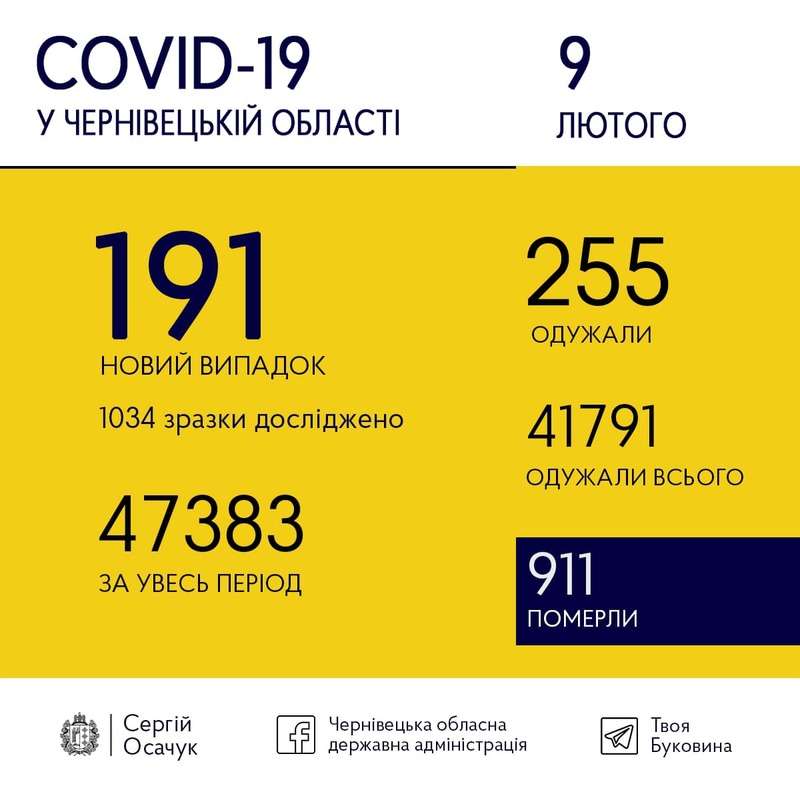 9 лютого на Буковині виявили 191 новий випадок коронавірусу.