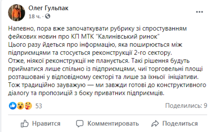 «Напевно, пора вже започаткувати рубрику зі спростуванням фейкових новин про КП МТК «Калинівський ринок». Цього разу йдеться про інформацію, яка поширюється між підприємцями та стосується реконструкції 2-го сектору.