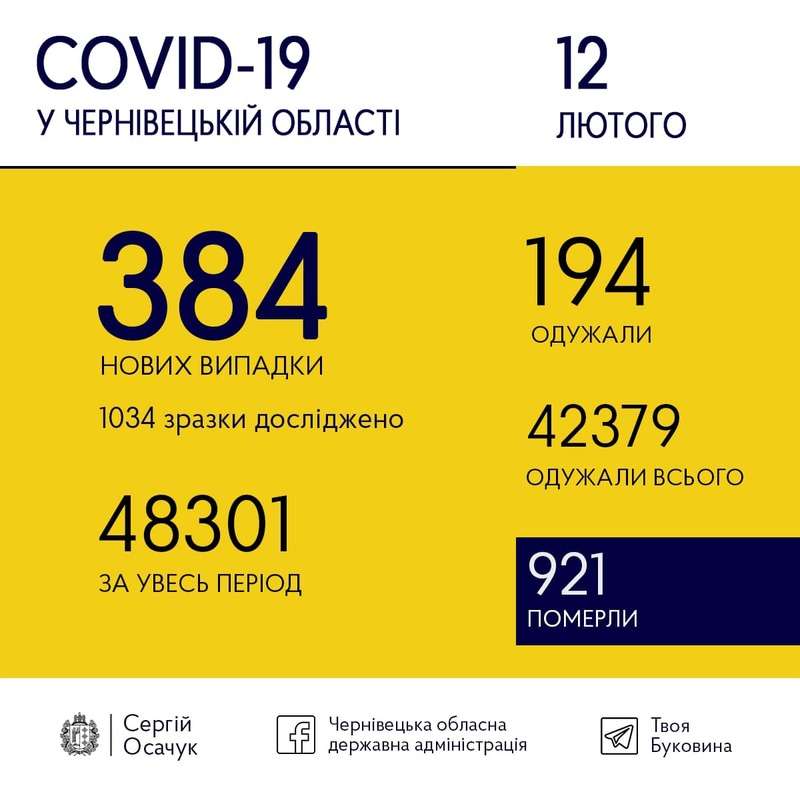 12 лютого на Буковині виявили 384 нових випадки коронавірусу.
