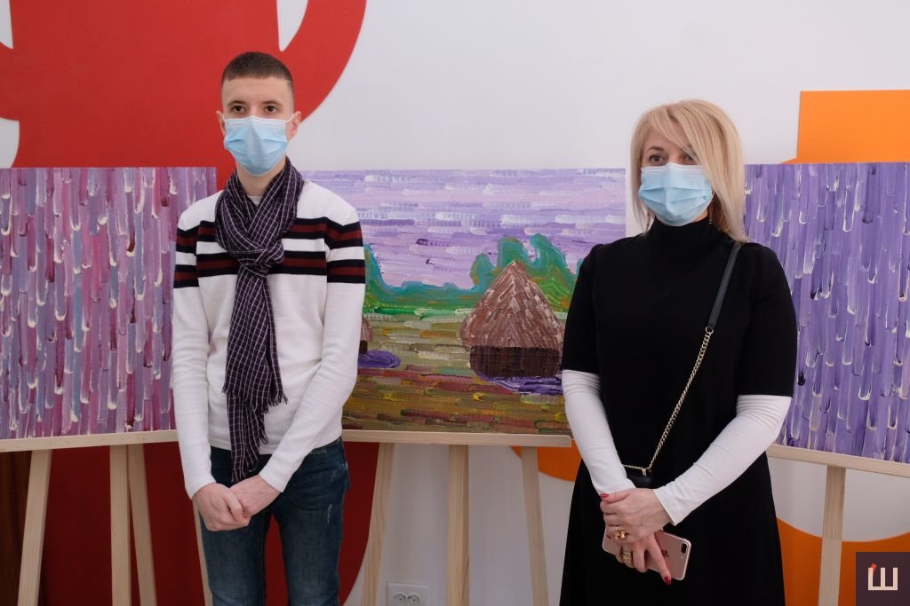«Ця колекція картин вибрана під дизайн центру, щоб вписувалося в інтер’єр, у кольори. Тут представлені картини 2017, 2019 і 2020-го років. Надихайтеся», — сказала мати художника Альона Гулько.