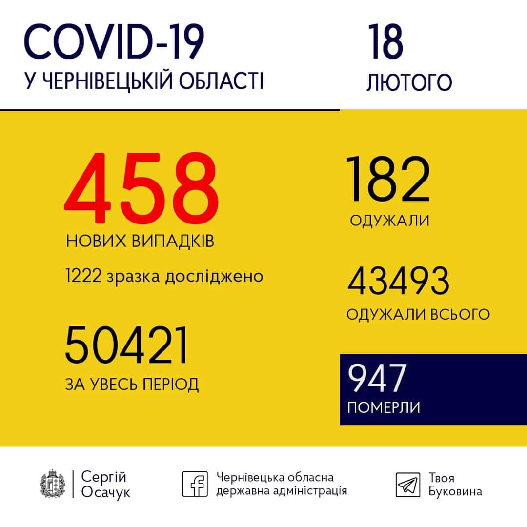 18 лютого в Чернівецькій області виявили 458 нових випадків інфікування коронавірусом. Також відомо, що 182 пацієнти одужали за минулу добу.