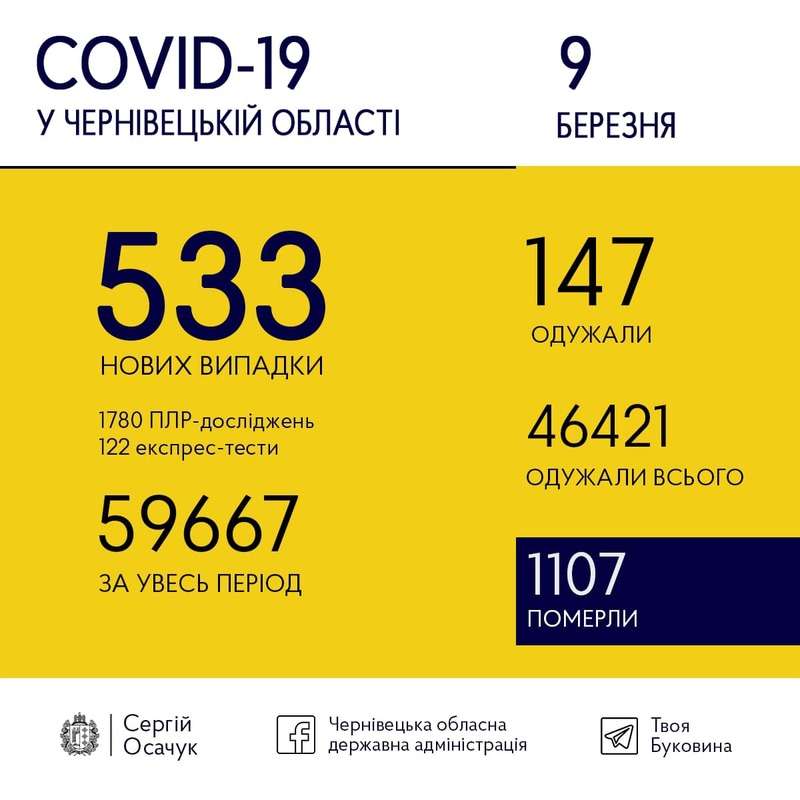 9 березня на Буковині виявили 533 нових випадки коронавірусу.