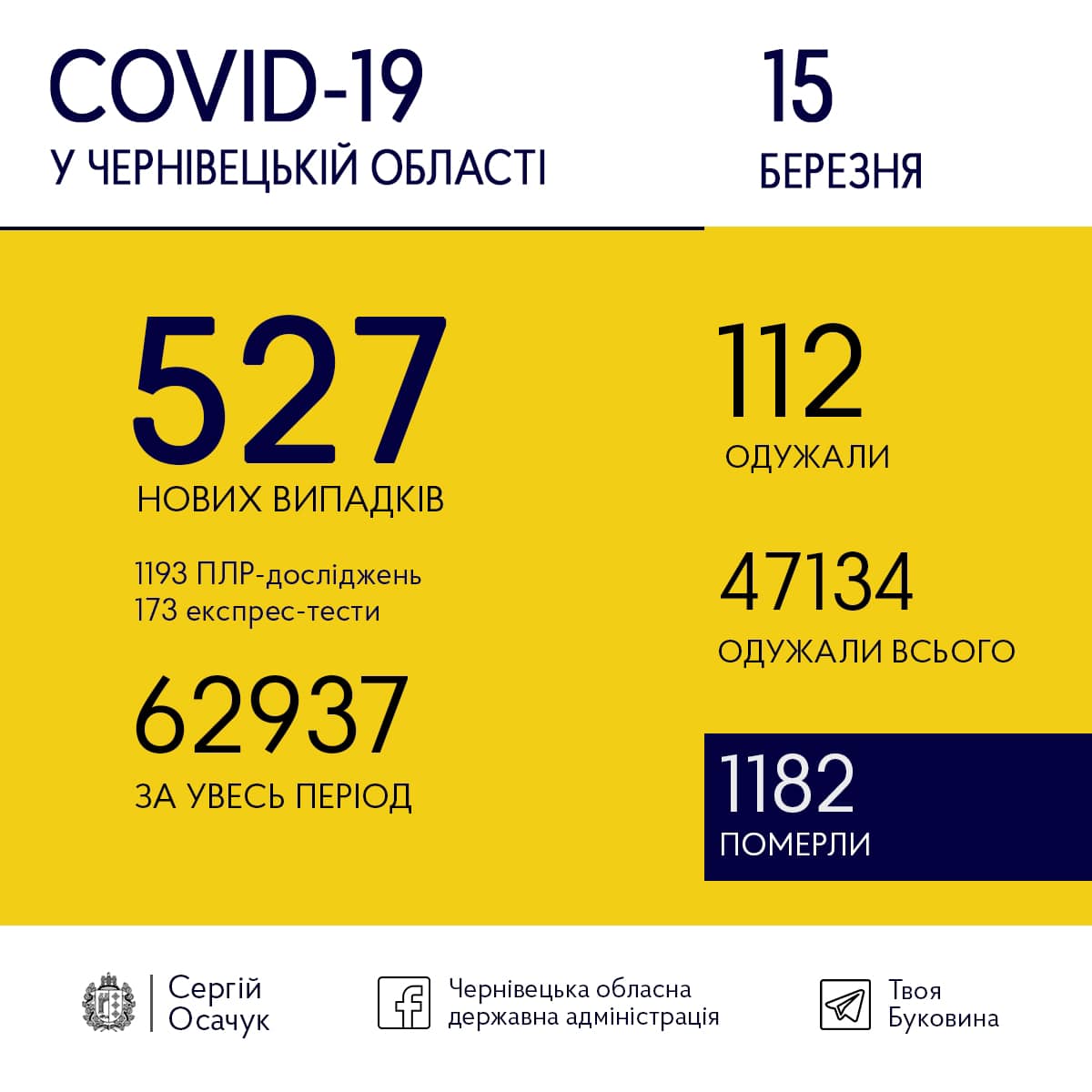 За весь час пандемії у Чернівецькій області зафіксували 62 937 випадків. Одужали 47 134 особи, а померли 1182.