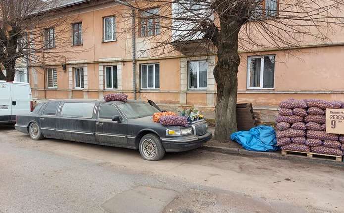 На опублікованих кадрах на капоті лімузину розмістили кілька мішків з картоплею та цибулею, а також ящик з вазонами. До речі, картоплю продають по 9 гривень.