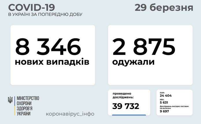 8 346 нових випадків коронавірусної хвороби COVID-19 зафіксовано в Україні станом на 29 березня 2021 року. Зокрема, захворіли 344 дитини та 140 медпрацівників. Про це повідомляє телеграм-канал Коронавірус Інфо.