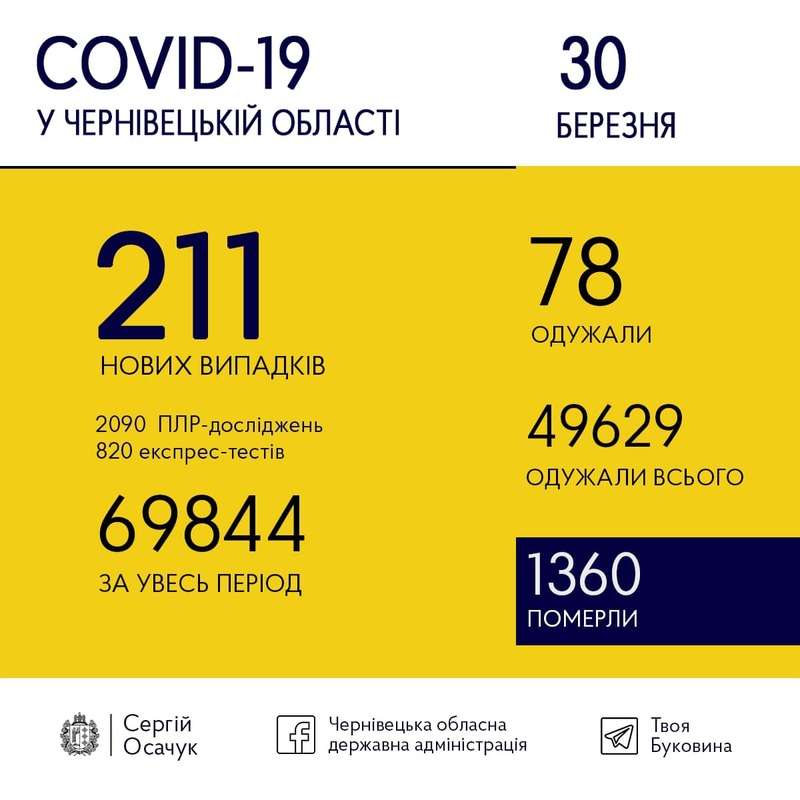 30 березня на Буковині виявили 211 нових випадків коронавірусу.