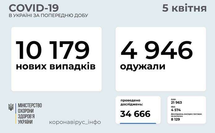 10 179 нових випадків коронавірусної хвороби COVID-19 зафіксовано в Україні станом на 5 квітня 2021 року. Зокрема, захворіли 431 дитина та 152 медпрацівники. Про це йдеться у Telegram-каналі “Коронавірус-інфо”.
