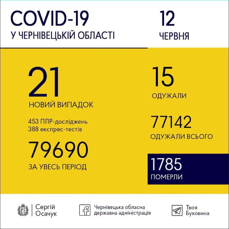 12 червня на Буковині виявили 21 новий випадок коронавірусу.