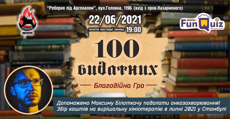 22 червня у Чернівцях проведуть розважально-інтелектуальний квіз на тему «100 видатних». Зібрані під час гри кошти направлять на лікування телеоператора Максима Білоткача.