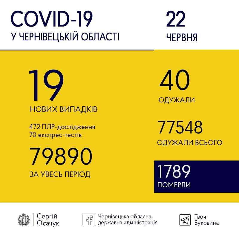 Одужали цього дня 40 осіб.Таким чином з початку пандемії у Чернівецькій області діагностували 79890 випадок захворювання на коронавірус, 77548 осіб одужали, 1789 людей померли.