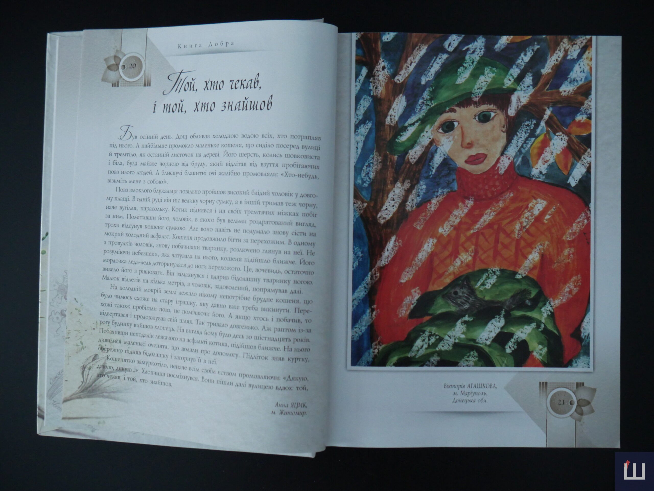 На холодній мокрій землі лежало нікому непотрібне брудне кошеня, що було чимось схоже на стару іграшку, яку давно вже треба викинути […]. Підліток зняв куртку, обережно підняв бідолашку і загорнув її в куртку. Вони пішли далі вулицею вдвох: той, хто чекав, і той, хто знайшов», — з історії Анни Яцик (м. Житомир), «Той, хто чекав, і той, хто знайшов»