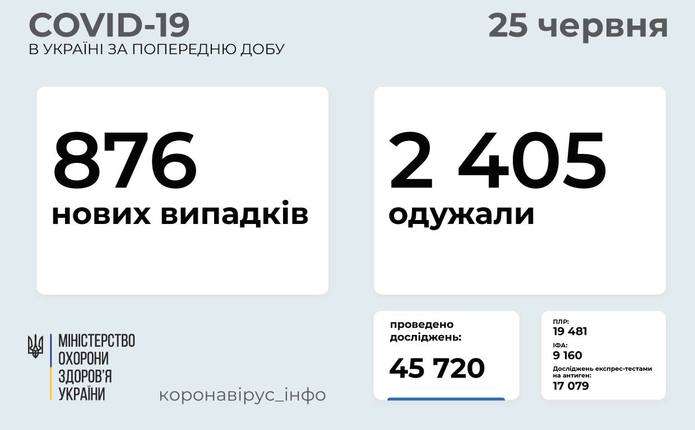 876 нових випадків коронавірусної хвороби COVID-19 зафіксовано в Україні станом на 25 червня 2021 року. Зокрема, захворіли 36 дітей та 32 медпрацівники. Про це інформує телеграм-канал Коронавірус Інфо.