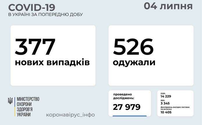 377 нових випадків коронавірусної хвороби COVID-19 зафіксовано в Україні станом на 4 липня 2021 року. Зокрема, захворіли 11 дітей та 5 медпрацівників. Про це інформує телеграм-канал Коронавірус Інфо.