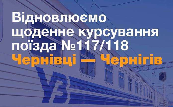 Нічний швидкий поїзд «Буковина» № 117/118 сполученням Чернівці — Чернігів — Чернівці з 7 липня відновлює щоденне курсування замість курсування через день.