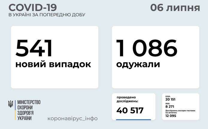 541 новий випадок COVID-19 зафіксовано в Україні станом на 6 липня 2021 року. Зокрема, захворіли 26 дітей та 11 медпрацівників. Про це інформує телеграм-канал Коронавірус Інфо.