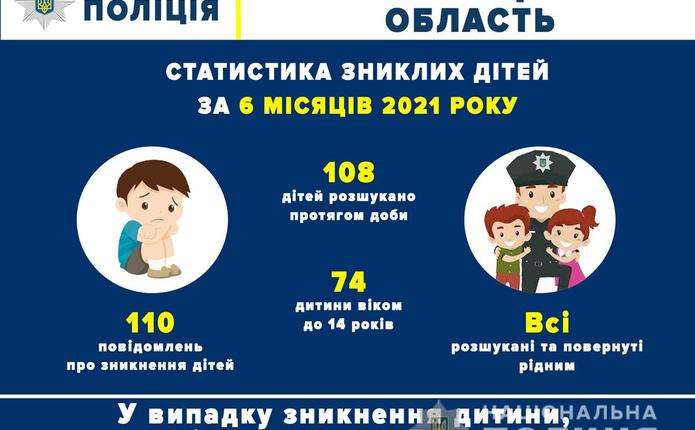 За цей період  до поліції надійшло 110 повідомлень про зникнення неповнолітніх буковинців, які самовільно вийшли з дому та не повернулися. Поліцейські оперативно відреагували на ці звернення та відшукали всіх зниклих дітей, 98% з них – протягом доби. Здебільшого їх вік становить до 14 років.
