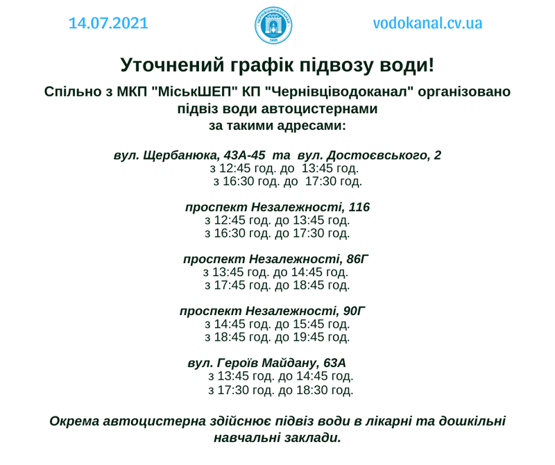 Організовано підвіз води по проспекту Незалежності і прилеглих вулицям. Попередньо води не буде у цьому районі до 20 вечора.