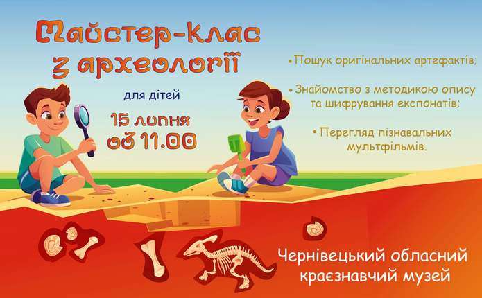 Сьогодні, 15 липня 2021 року, об 11.00, у Чернівецькому обласному краєзнавчому музеї відбудеться майстер-клас з археології для дітей.