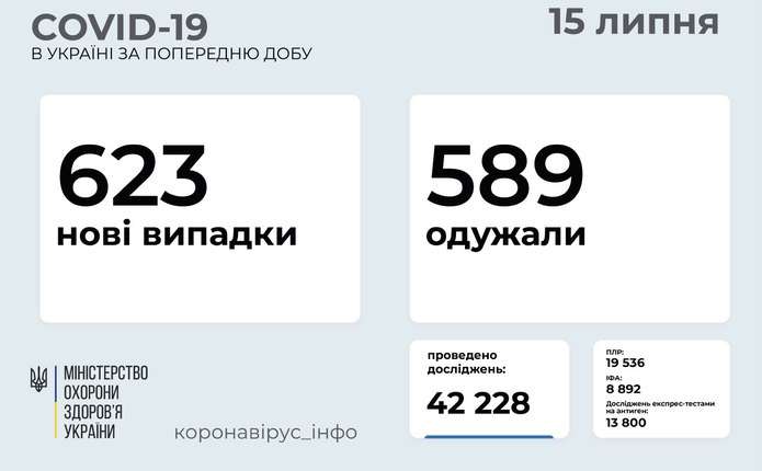 623 нові випадки COVID-19 зафіксовано в Україні станом на 15 липня 2021 року. Зокрема, захворіли 37 дітей та 12 медпрацівників. Про це повідомляє телеграм-канал Коронавірус Інфо.