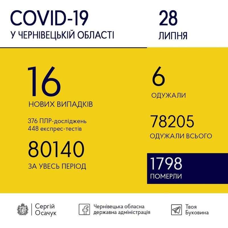 28 липня на Буковині виявили 16 нових випадків коронавірусу.