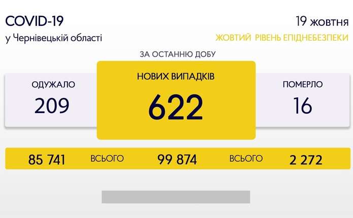 За минулу добу, 19 жовтня 2021 року, на Буковині зафіксовано 622 нових випадки зараження коронавірусом.