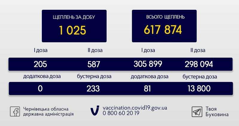 За весь період на Буковині зробили 617 874 щеплень, з них першою дозою імунізувалися 305 899 людей, другою – 298 094, додатковою – 81, бустерною – 13800.