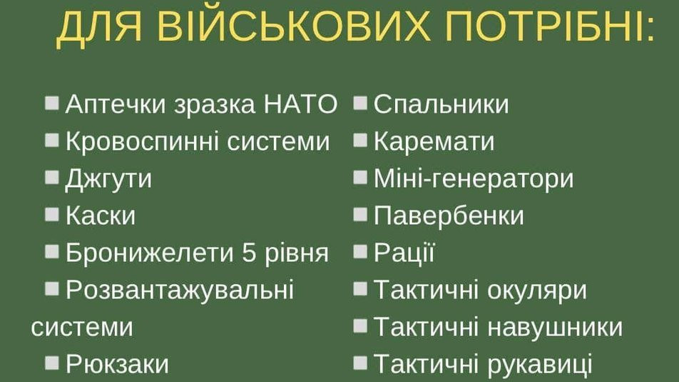 Наразі військовим необхідні: генератори бензинові (маленькі), лопати, продовжувачі, трійники, павербанки, засоби гігієни, шоломи, примуси газові із запасками, спальні мішки, каримати, флісові кофти, форми літні, шапки, рукавиці, термобілизна, шкарпетки, труси, будівельні матеріали, турнікети медичні, індивідуальні перев’язочні пакети, батарейки на ПВС, батарейки до Мотороли, зарядні пристрої до Мотороли, берці (41-45 розміри), кросівки (36-44 розмір), масло для чистки зброї, металеві кружки, вологі серветки, моторне мастило w-40, акумулятори, масло для двотактних двигунів, каски, бронежилети 5 рівня, розвантажувальні системи, рюкзаки, спортивні сумки, мінігенератори, рації, тактичні окуляри, тактичні навушники, тактичні рукавиці, дизель, бензин, стрілецька зброя, набої, протитанкові комплекси, електрогенератори, оцинкований метал, акумуляторні ліхтарики.