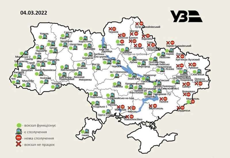 АТ “Укрзалізниця” повідомило актуальну інформацію щодо залізничного сполучення та функціонування вокзалів в Україні. Компанія опублікувала карту.