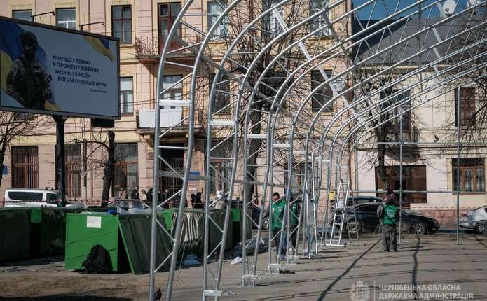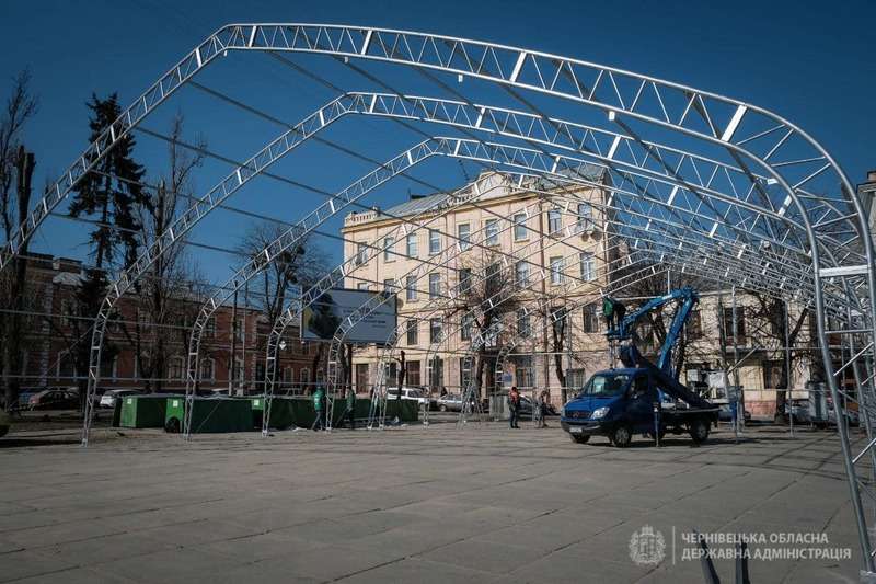 Велику гуманітарну базу, де надаватимуть допомогу переселенцям, зводять на Соборній площі у Чернівцях.