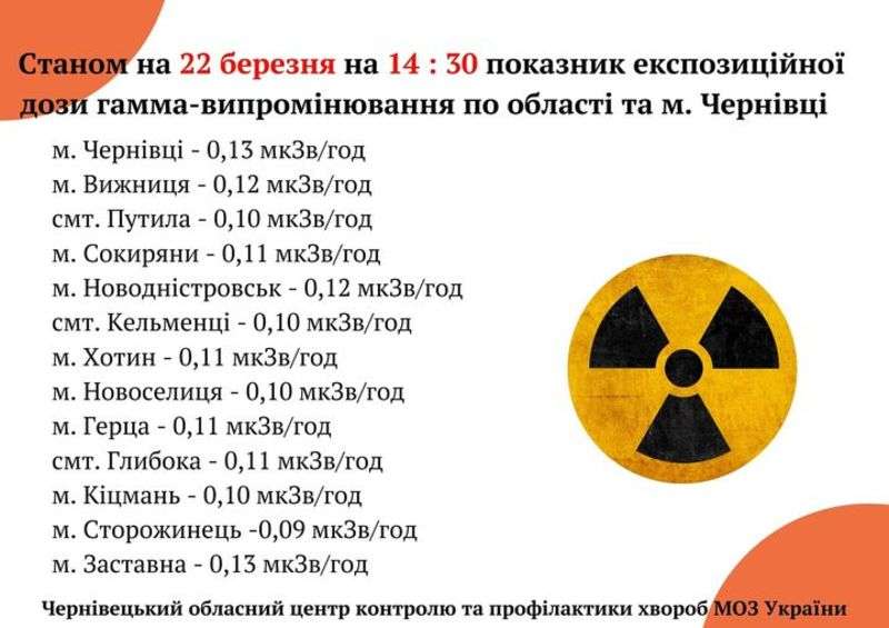 Станом на 22 березня на 14:30 показник дози гамма-випромінювання у Чернівцях та у Чернівецькій області знаходиться у межах норми та не перевищує 0,13 мкЗ/год.