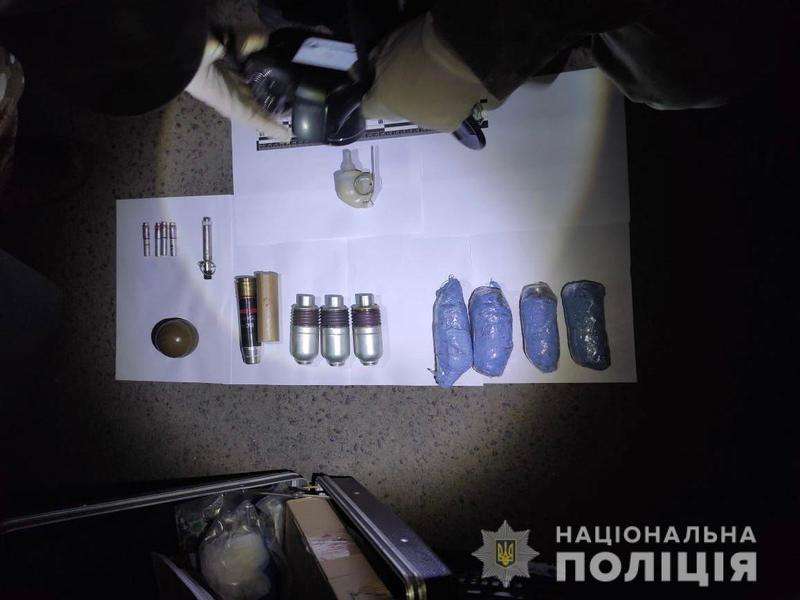 Під час огляду автомобіля поліцейські виявили зброю, гранати до підствольних гранатометів та РГН із запалом, мінний універсальний підривник та димові шашки. На місці працювала група вибухотехніків.