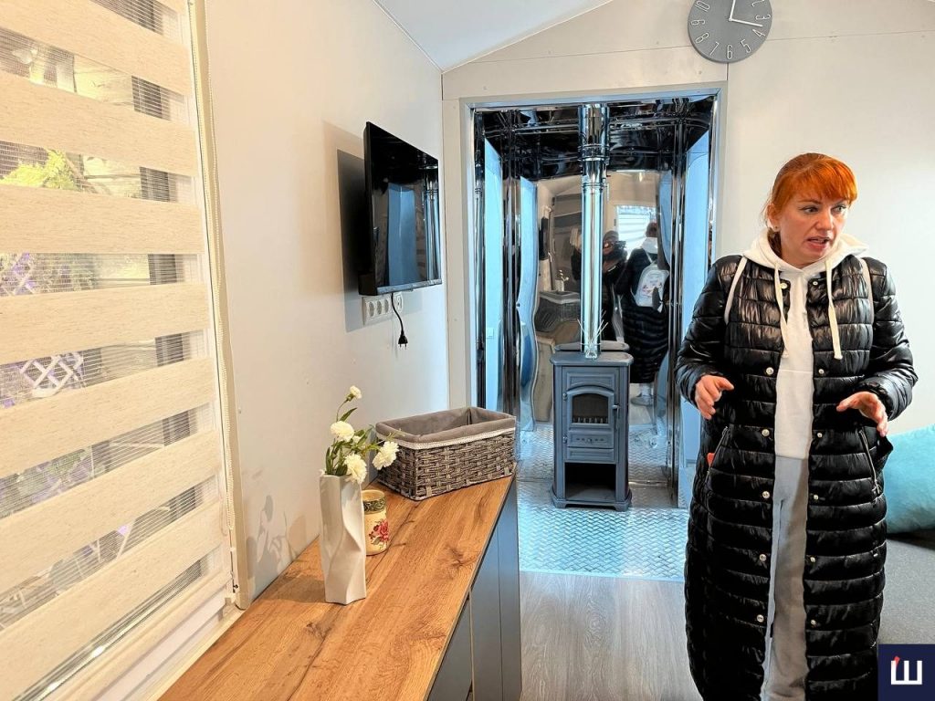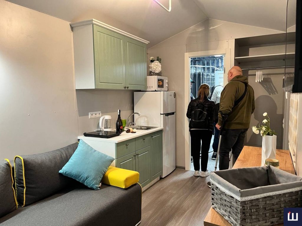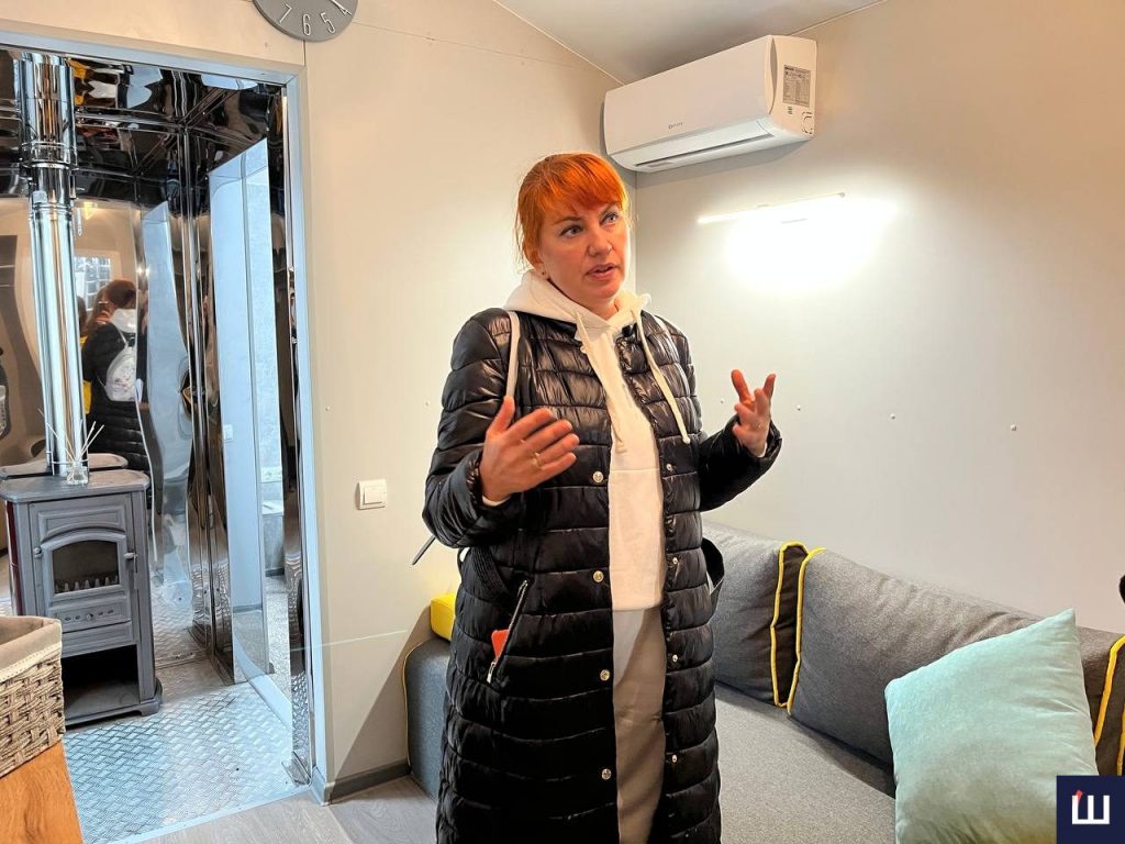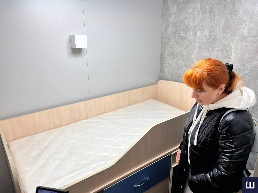 «Тут є розкладний диван. Мінікухня, холодильник, кондиціонер, телевізор, санвузол з усім необхідним. Тобто є всі умови, щоб можна було комфортно і за потреби проживати не один тиждень», — зазначає дружина співавтора проєкту Світлана Аляб’єва.