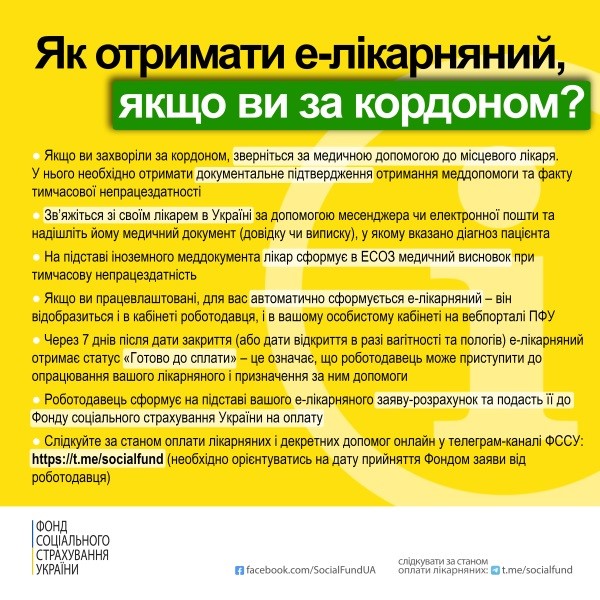 Щоб отримати виплати від Фонду з-за кордону – необхідно звернутись до місцевого лікаря у країні, де Ви перебуваєте, та отримати документальне підтвердження факту тимчасової непрацездатності. Фахівці Міністерства охорони здоров’я України спростили процедуру – тож лікар в Україні зможе створити для вас медичний висновок дистанційно, на підставі іноземної виписки чи довідки із зазначеним діагнозом. Після створення медвисновку е-лікарняний сформується автоматично для всіх працевлаштованих – такий створений без особистого прийому лікарняний є підставою для отримання допомоги від Фонду соціального страхування України.