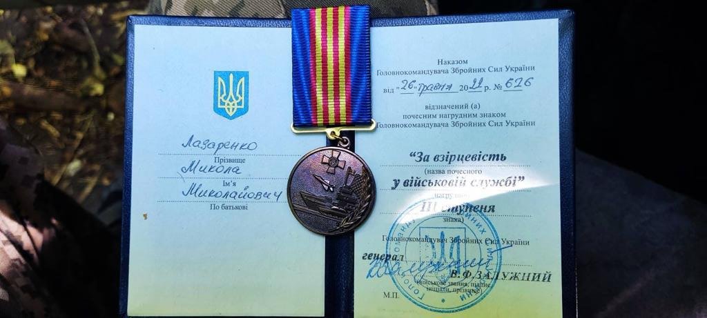 Наказом Головнокомандувача Збройних Сил України Валерія Залужного від 26 травня 2022 року №626, за «Взірцевість у військовій службі», почесним нагрудним знаком ІІІ ступеня відзначено Лазаренка Миколу Миколайовича.
