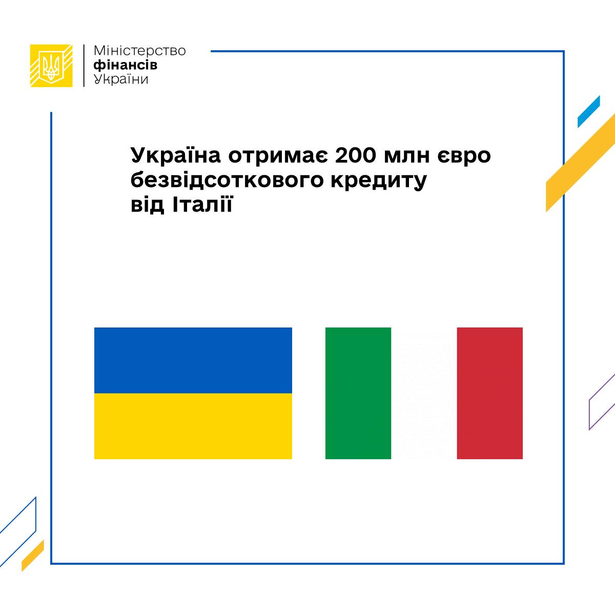 12 липня 2022 року Кабінет Міністрів України прийняв постанову про залучення безвідсоткового кредиту від Італії на суму до 200 млн євро через адміністративний рахунок МВФ – повідомляє сайт Мінфіну (Постанова Кабінету Міністрів України «Про здійснення державних зовнішніх запозичень у 2022 році шляхом залучення кредиту від Уряду Італійської Республіки в особі Міністра економіки та фінансів Італійської Республіки»).