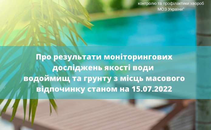 З метою гігієнічної оцінки безпечності води водойм в місцях масового відпочинку населення на водних об’єктах на території Чернівецької області, Державною установою «Чернівецький обласний центр контролю та профілактики хвороб Міністерства охорони здоров’я України» станом на 15.07.2022 року проведено моніторингові дослідження з 11 найбільш популярних місць відпочинку населення області, а саме: досліджено 54 проби води водойм за санітарно-хімічними, бактеріологічними та паразитологічними показниками; 27 проб за вірусологічними показниками та 39 проб на наявність холероподібних вібріонів.