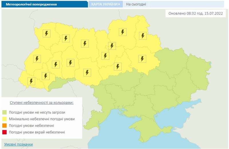 “Вдень 15 липня в західних, північних та більшості центральних областей грози”, – йдеться у попередженні.