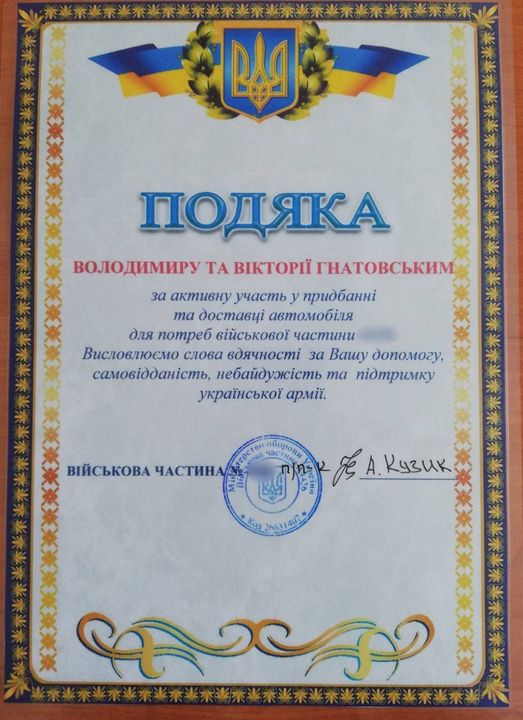 За самовідданість, небайдужість та підтримку української армії родину Гнатовських нагороджено Подякою командира військової частини.