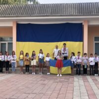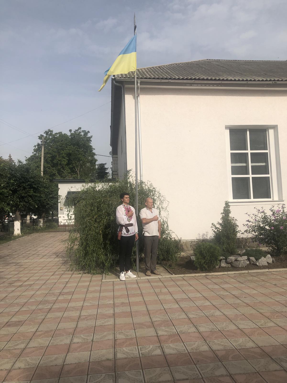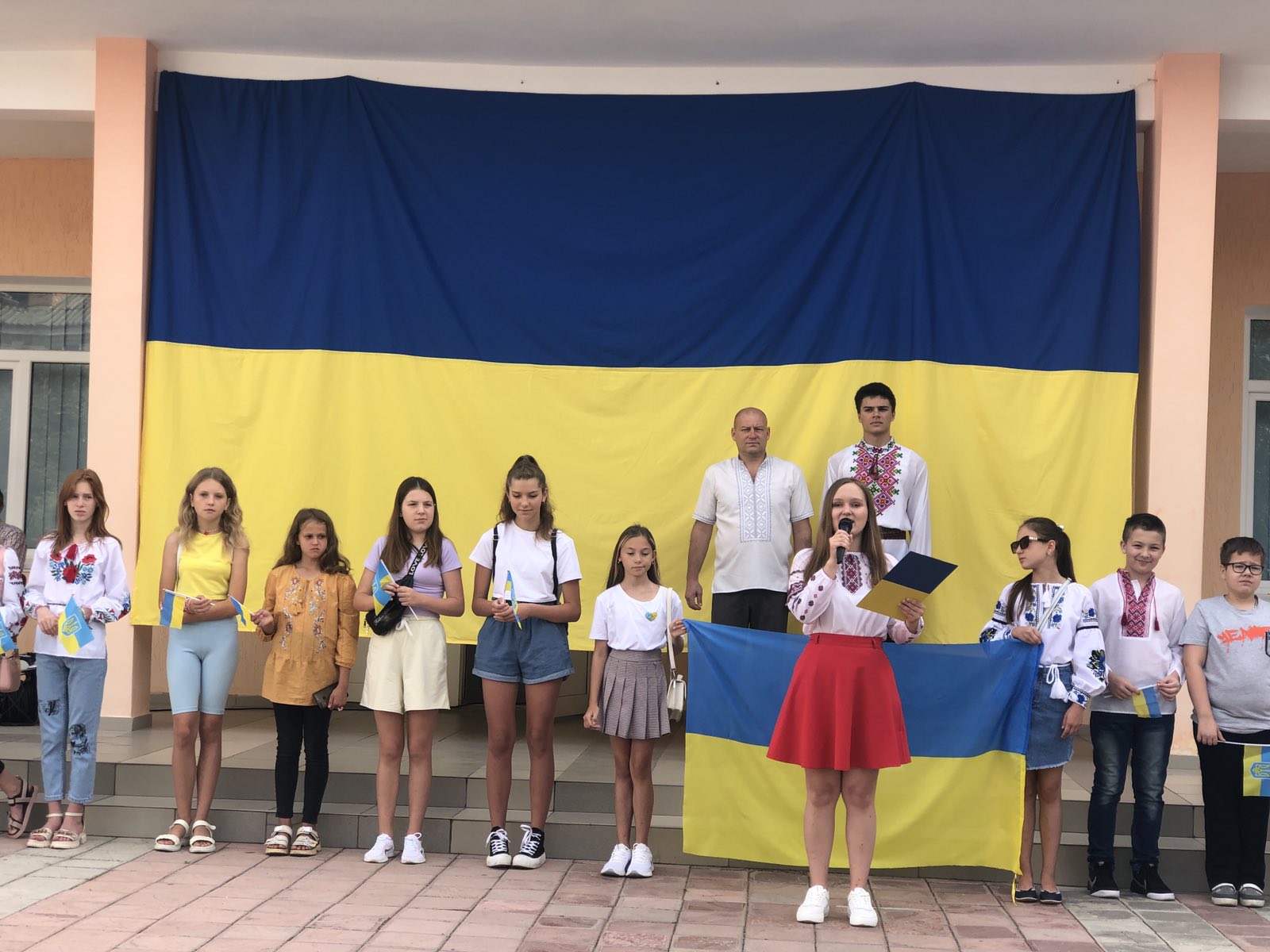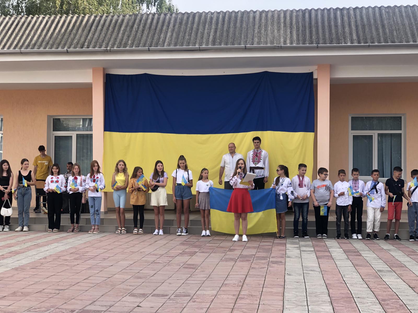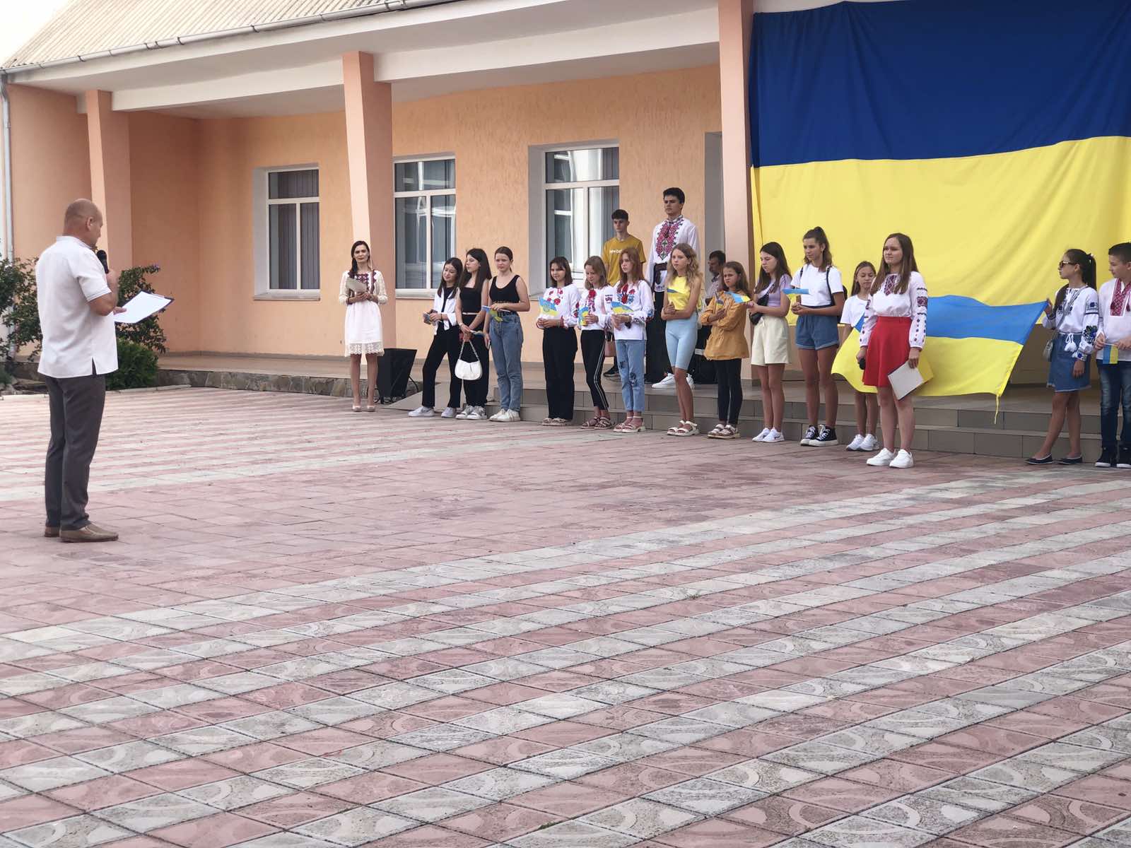 Розпочали урочисту церемонію підняття Державного Прапора України директор навчального закладу – Олексій Миколайович Козловський та учень 11-класу – Давид Паскалюк, які на фоні «Запорізького маршу» у вишиванках гордо крокували до стягу. Учень ставши на коліно поцілував прапор та на фоні спільного виконання Державного Гімну України підняли прапор вгору. Далі ведуча патріотичного заходу запросила до слова директора ЗЗСО, який у своєму виступі акцентував увагу учнів 6-А, 7-А, 7-Б, 7-В та 11 класів на те, що наш прапор символізує мирне синє небо та золоту родючу землю. Що сьогодні кожен із нас робить все, щоб рідна земля була засіяна не снарядами, мінами та кулями, а чорнобривцями, волошками і мальвами. Та запропонував учням вивісити сьогодні прапор зі свого вікна чи пов’язати собі на руку синьо – жовту стрічку, або просто про себе попросити у Бога Миру та процвітання для нашої країни. Після чого всі присутні схилили голови в скорботній хвилині мовчання за загиблих захисників, мирних жителів та усіх патріотів України, які віддали своє життя заради нашого щасливого майбутнього.
