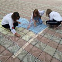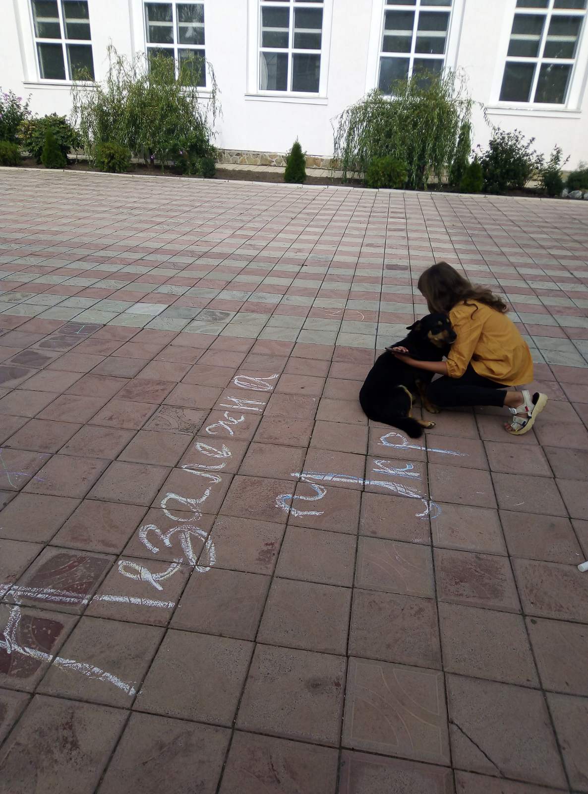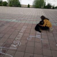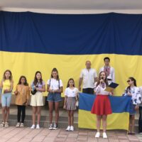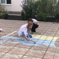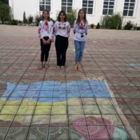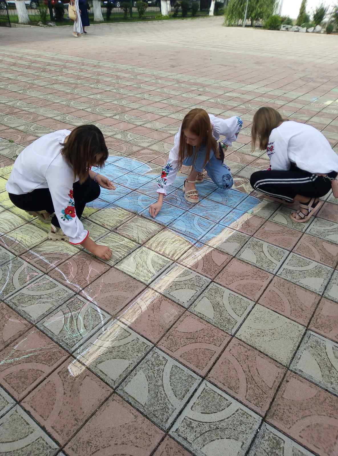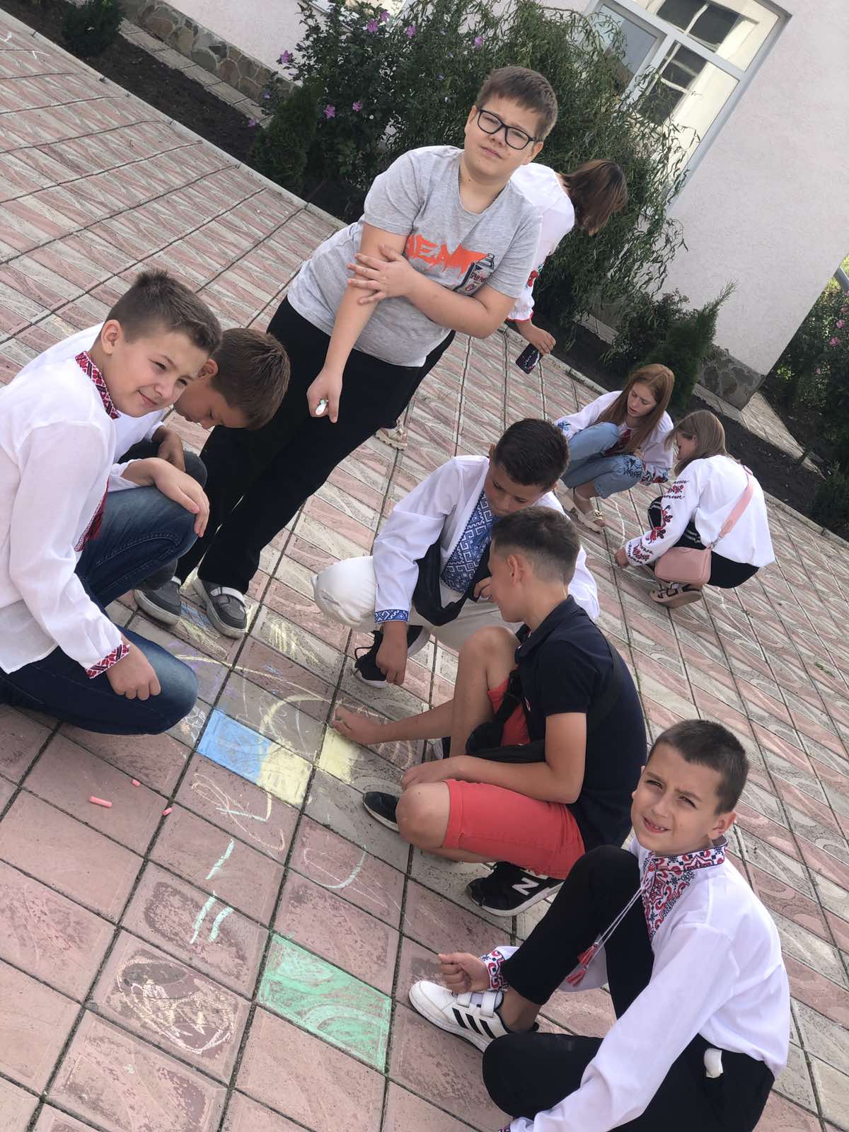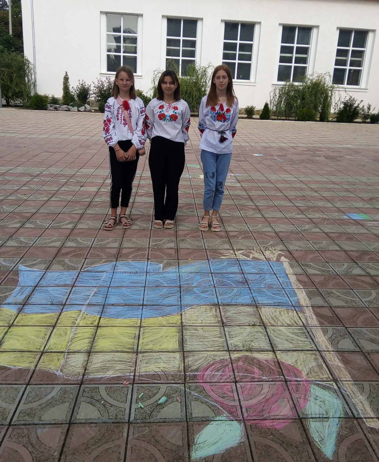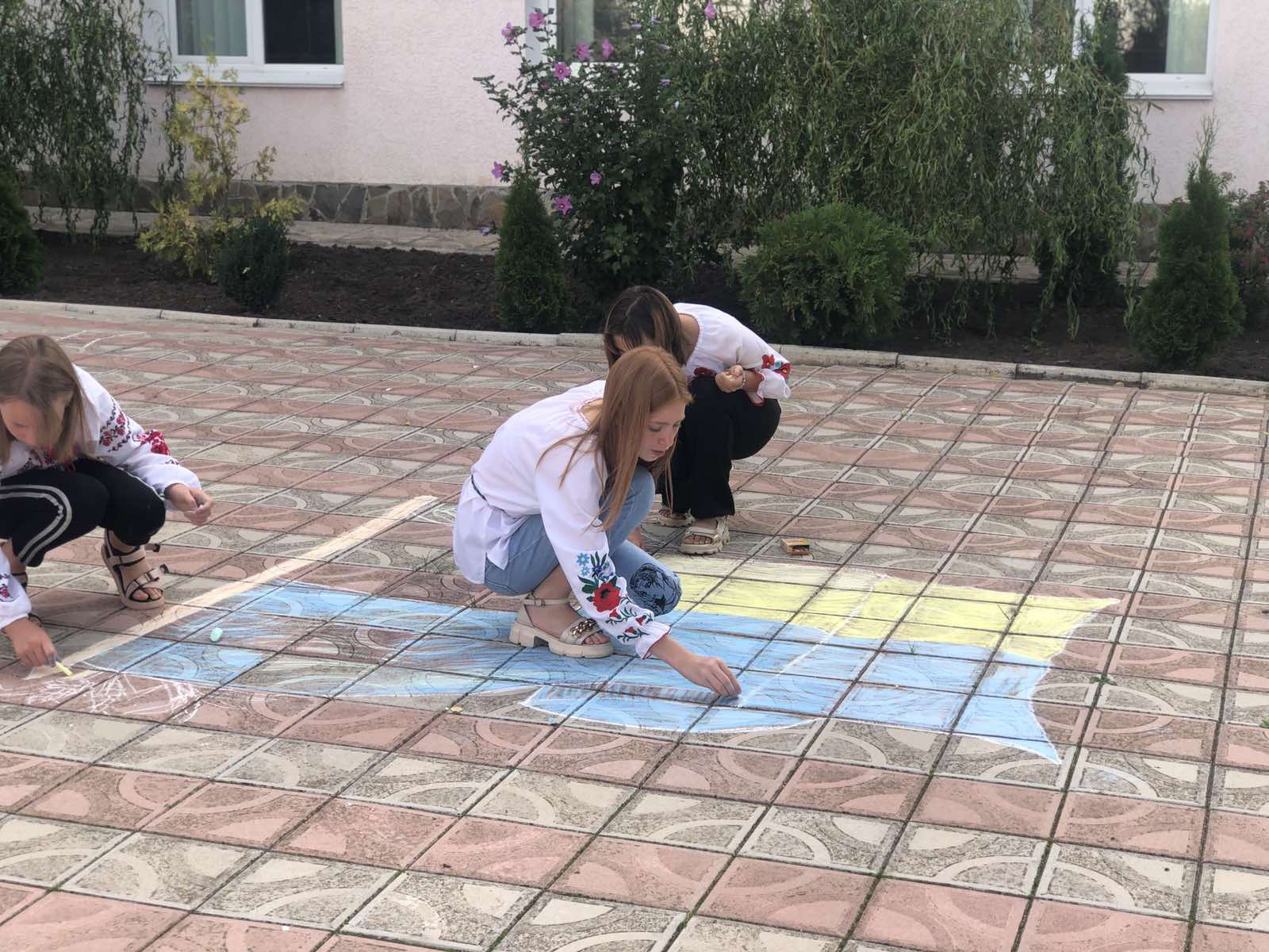 На завершення заходу відбувся патріотичний флешмоб: «Два кольори у прапорі злились» за участі учнів та вчителів навчального закладу. Після чого учні під керівництвом вчителя образотворчого мистецтва – Янчак Л.В. намалювали на асфальті патріотичні малюнки та побажання нашій Україні, адже у неї завтра День народження.