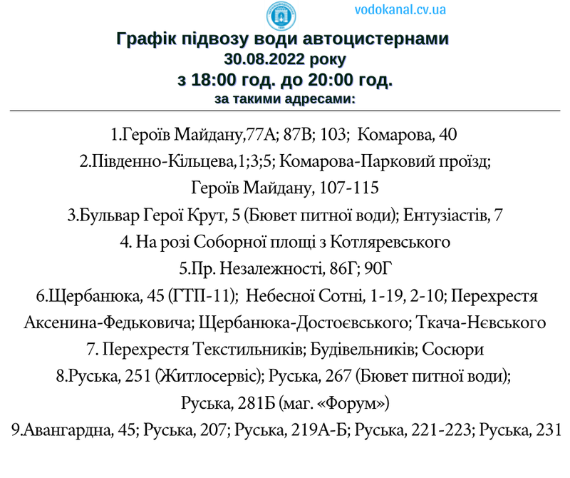 Водопостачання Садгірського району та вулиць Фастівської, Магалянської, Кишинівської, Січових Стрільців, Л. Кобилиці (частково), Гагаріна, Сагайдачного, Університетська, Бережанська, Сокольська, Прутська, Севастопольська та прилеглих буде здійснюватися в звичному режимі.